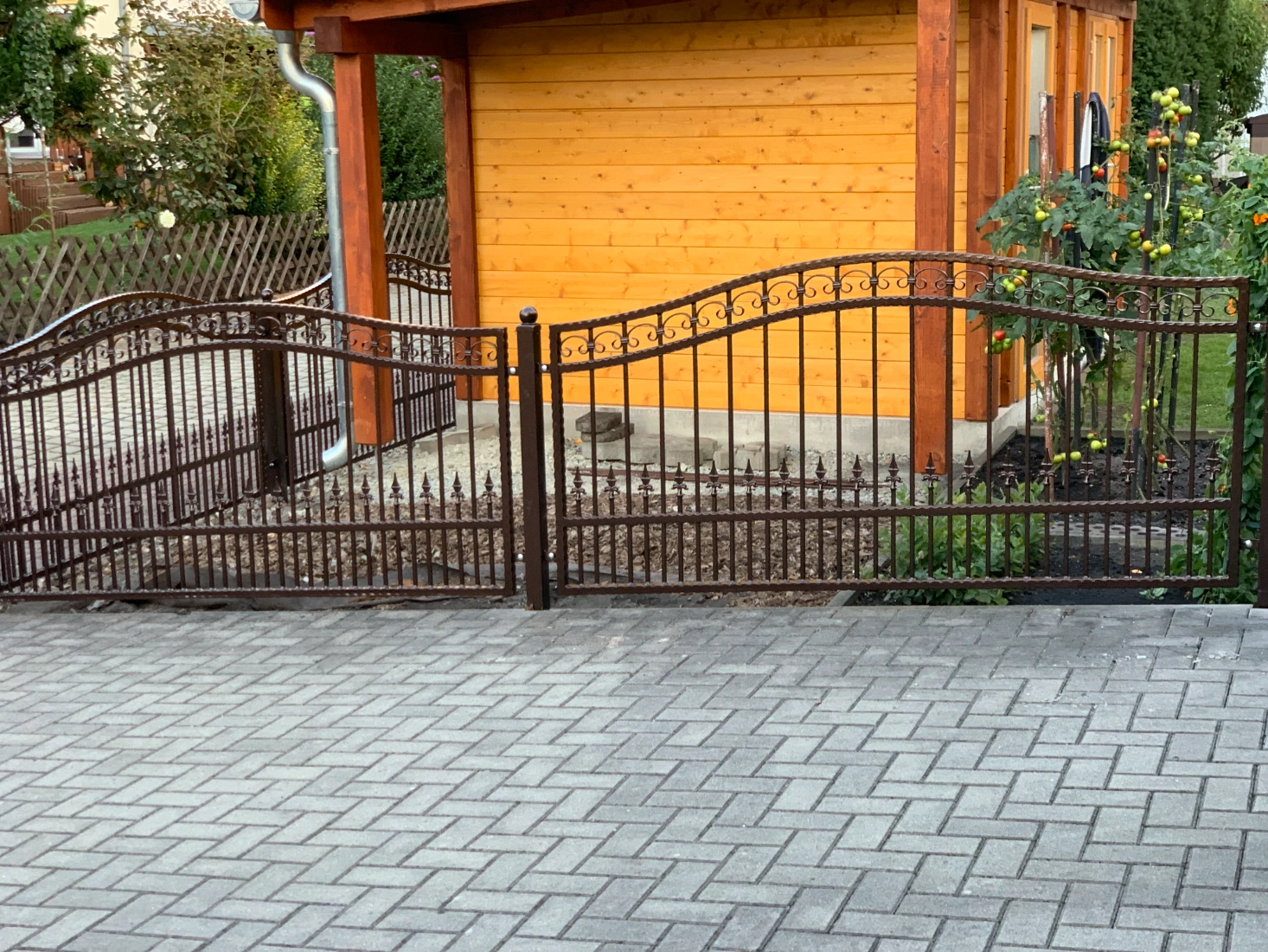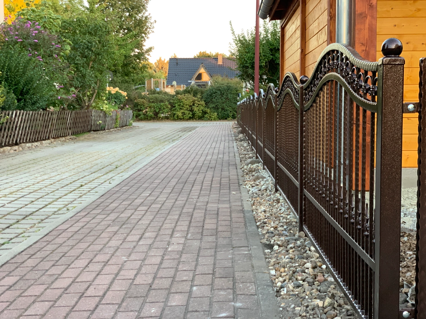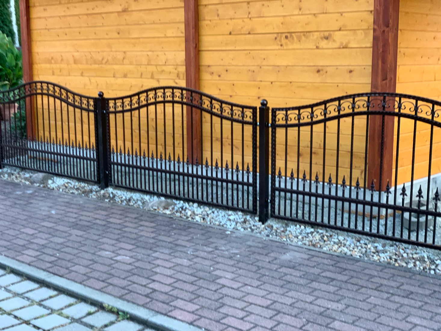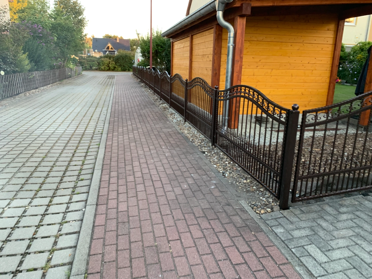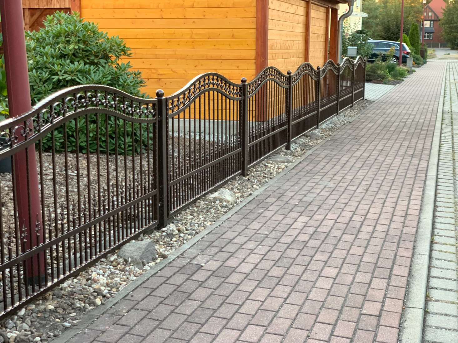 Die Fotos zeigen einen eleganten Metallzaun mit geschwungenen Linien und dekorativen Ornamenten. Dieses Design verleiht dem Grundstück eine klassische und einladende Ästhetik, ideal für traditionelle Architektur.