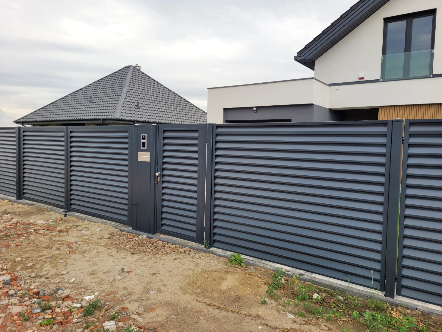 Die Bilder zeigen Zäune mit horizontalen Lamellen in anthrazitgrauer Farbe, die für Sichtschutz und eine moderne Optik sorgen. Diese Gestaltung fügt sich gut in zeitgemäße Architektur ein und bietet gleichzeitig Sicherheit und Privatsphäre.