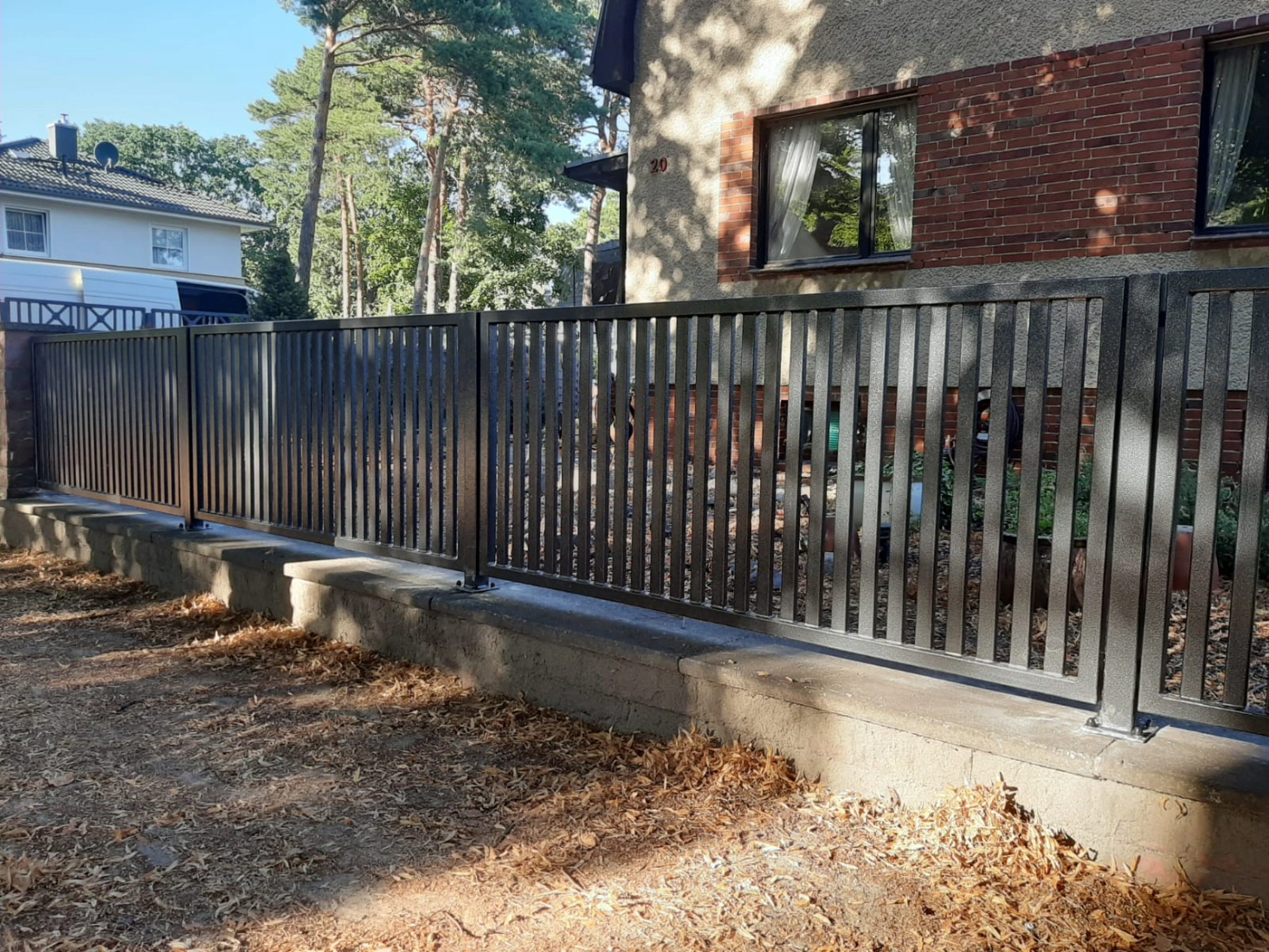 Die Bilder zeigen ein modernes Zaunsystem aus Metall mit passenden Toren, das das Grundstück stilvoll und sicher abgrenzt. Die vertikale Stabkonstruktion sorgt für eine klare und zeitgemäße Optik.