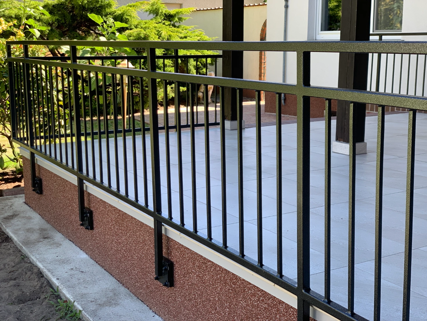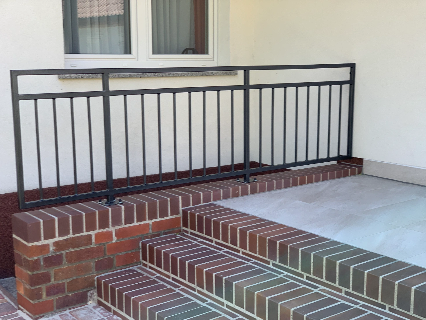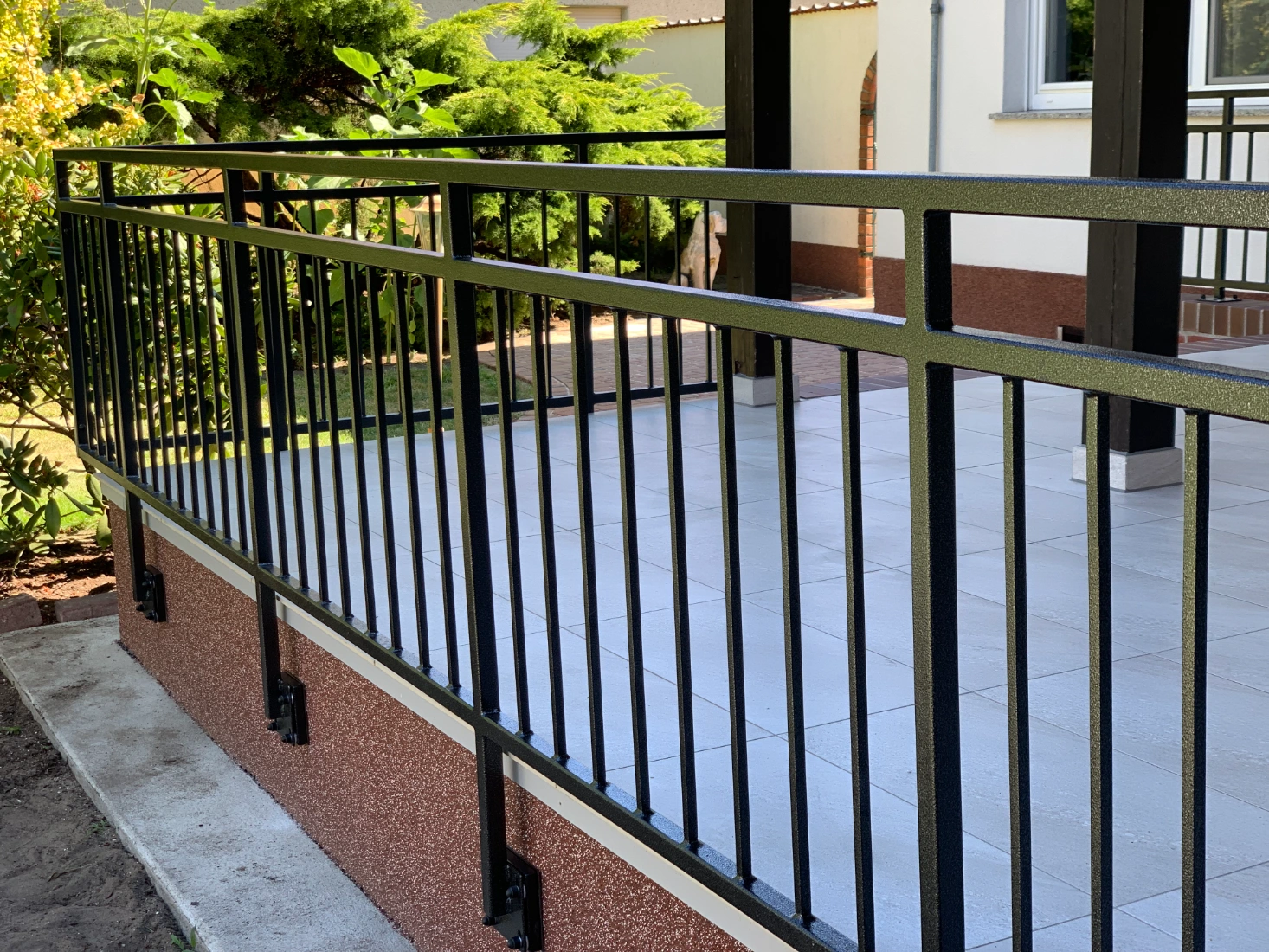 Die Fotos zeigen ein schlichtes, schwarzes Metallgeländer, das eine Terrasse umrandet. Es bietet Sicherheit und passt sich mit seiner minimalistischen Gestaltung gut in die Umgebung ein.