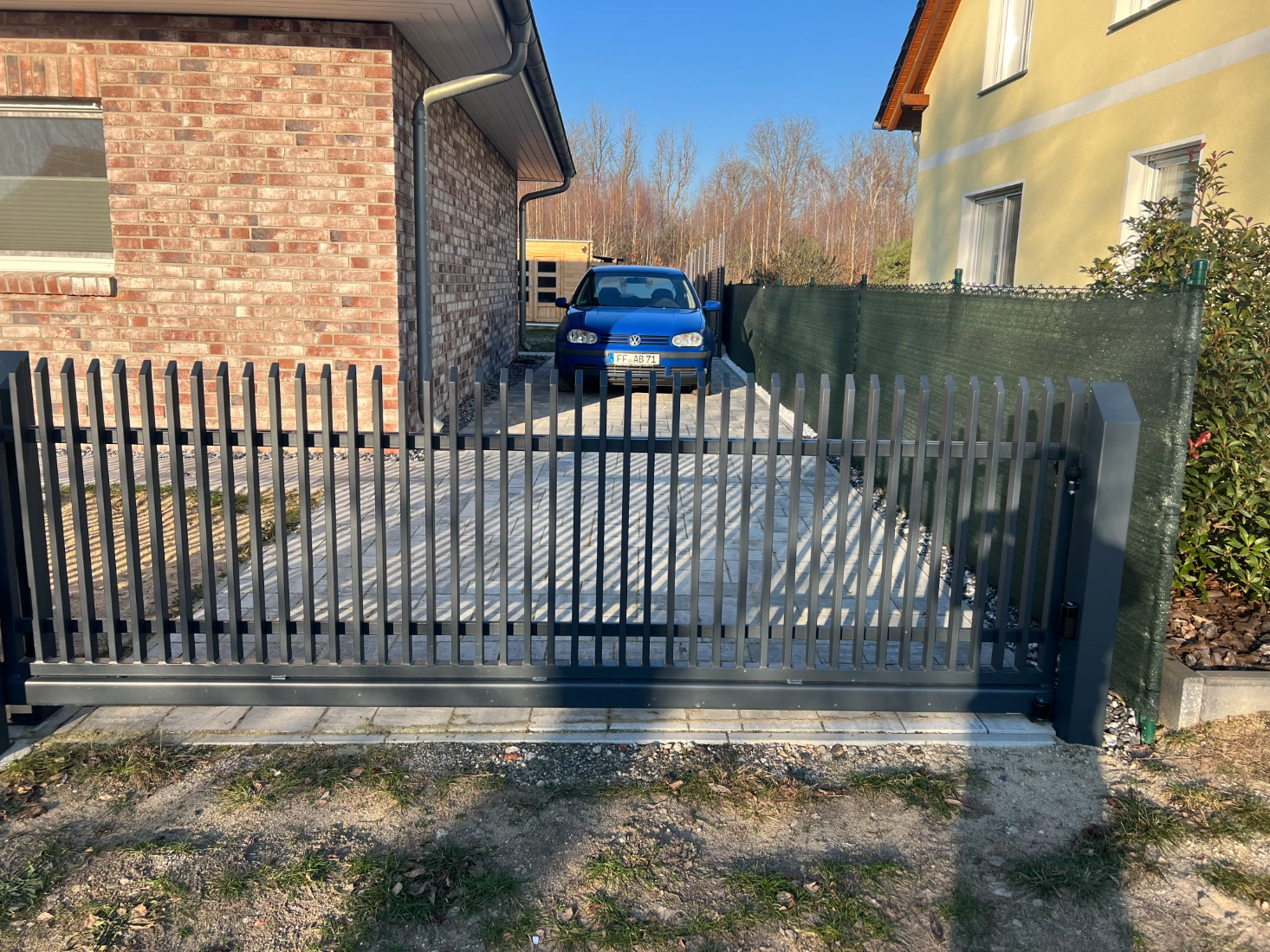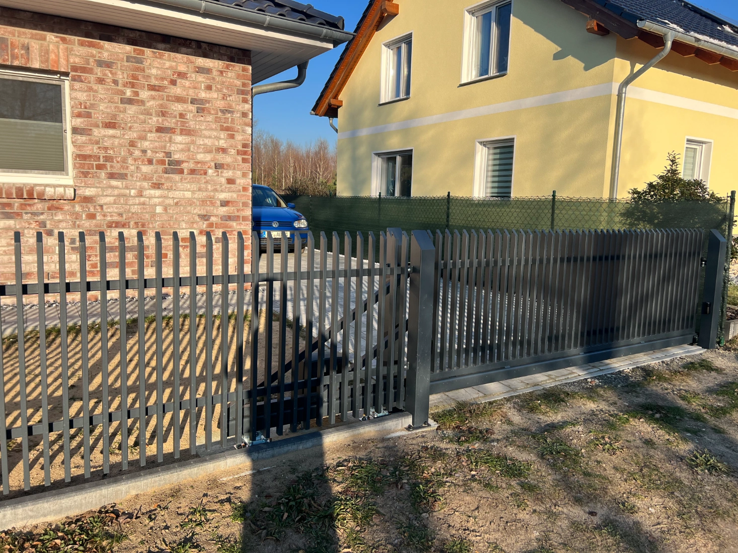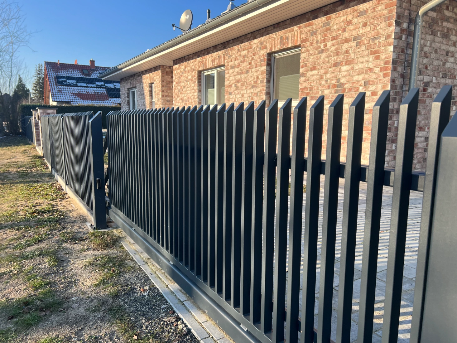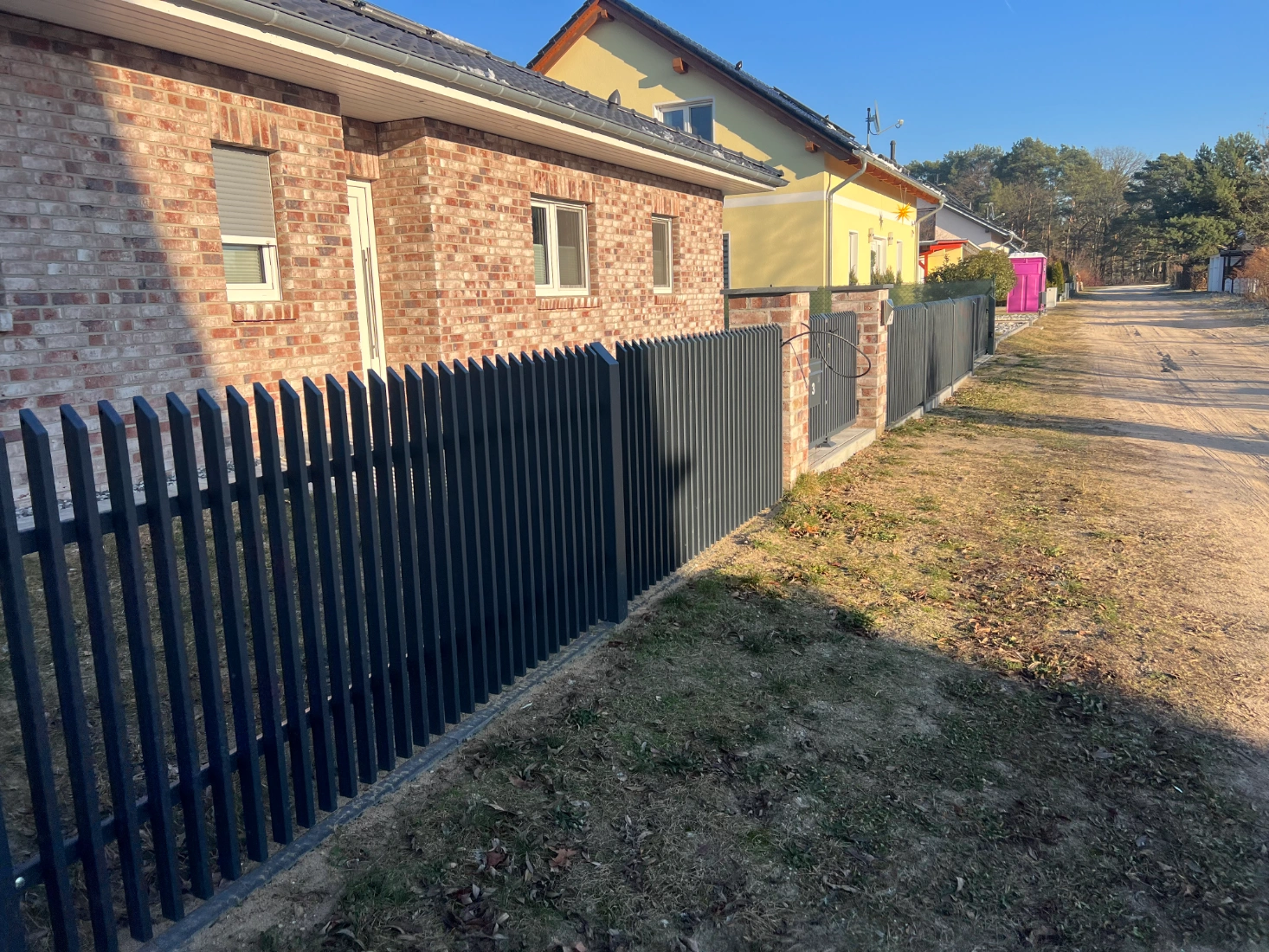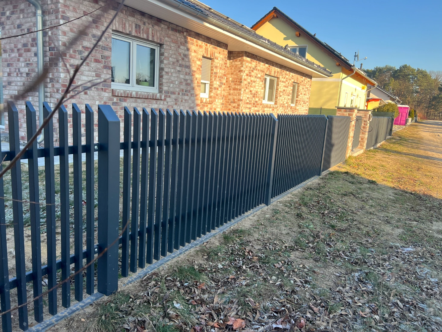 Die Bilder zeigen vertikale Metallzäune in einem schlichten, modernen Stil, der das Grundstück elegant und sicher abgrenzt. Diese Konstruktion sorgt für eine klare Linienführung und passt gut zu verschiedenen architektonischen Stilen.